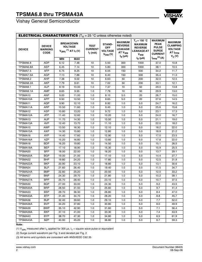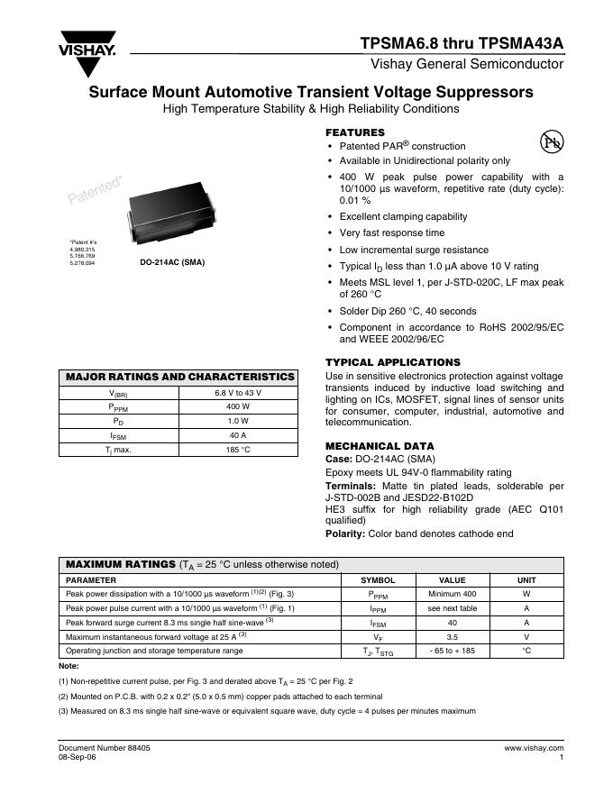 VISHAY Surface Mount Automotive Transient Voltage Suppressors High Temperature Stability & High Reliability Conditions 数据手册.pdf