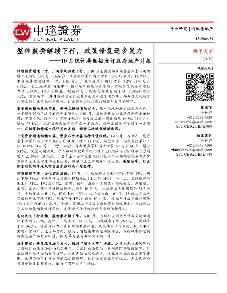 中达证券投资:内地房地产-10月统计局数据点评及房地产月报:整体数据继续下行,政策修复逐步发力.pdf