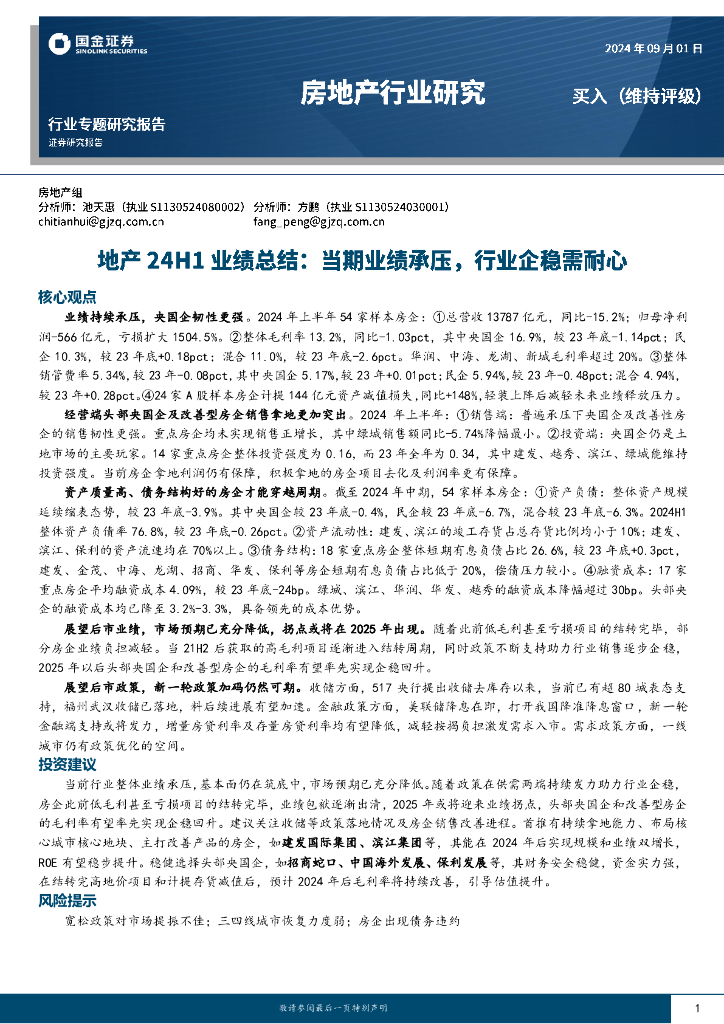国金证券:地产24H1业绩总结:当期业绩承压,行业企稳需耐心.pdf