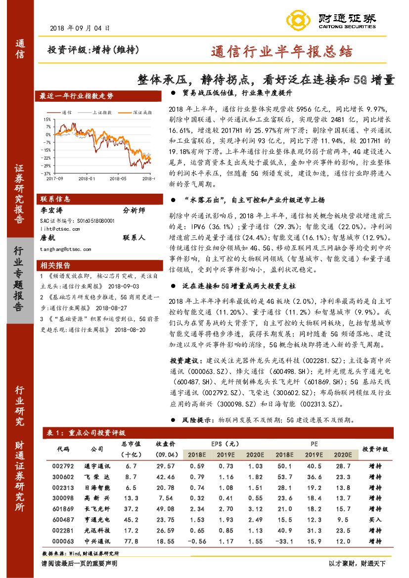 财通证券:通信行业半年报总结:整体承压,静待拐点,看好泛在连接和5G增量.pdf