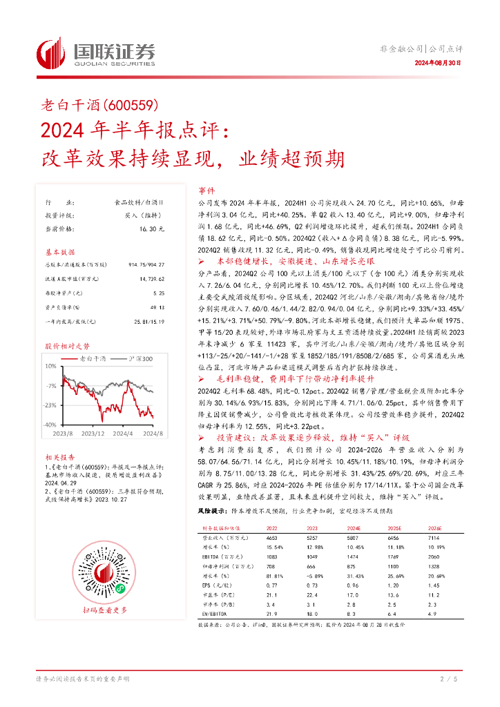 国联证券:老白干酒(600559)-2024年半年报点评:改革效果持续显现,业绩超预期.pdf