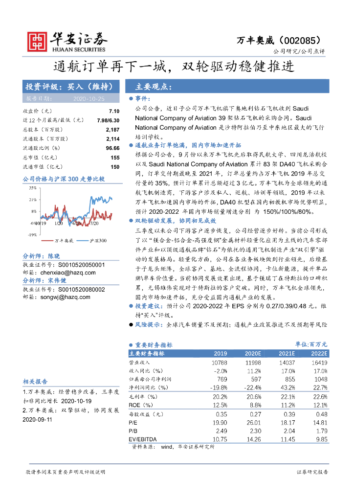 华安证券:万丰奥威(002085)-通航订单再下一城,双轮驱动稳健推进.pdf