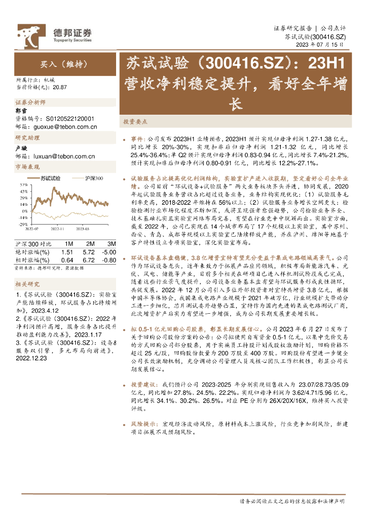 德邦证券:苏试试验(300416)-23H1营收净利稳定提升,看好全年增长.pdf