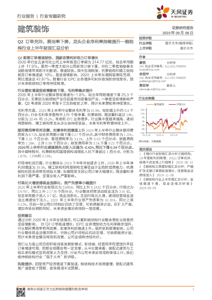 天风证券:钢结构行业上半年财报汇总分析:Q2订单充沛,费用率下降,龙头企业净利率持续提升.pdf