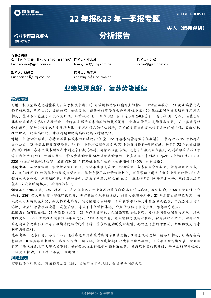 国金证券:食品饮料22年报&23年一季报专题分析报告:业绩兑现良好,复苏势能延续.pdf