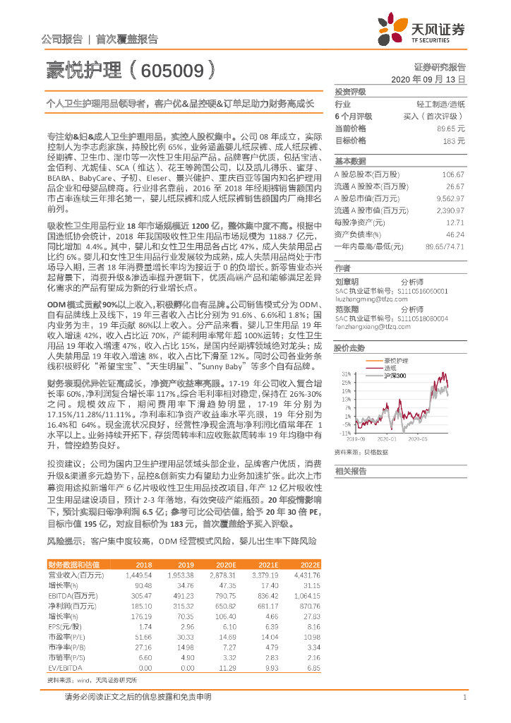 天风证券:豪悦护理(605009)-个人卫生护理用品领导者,客户优&品控硬&订单足助力财务高成长.pdf