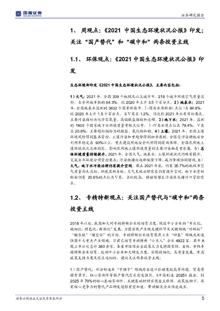 国海证券:环保&专精特新周报:《2021中国生态环境状况公报》印发;关注国产替代与碳中和两条投资主线.pdf