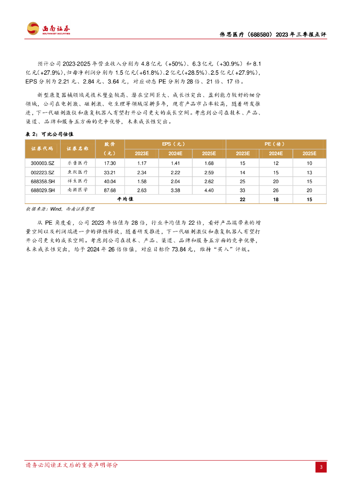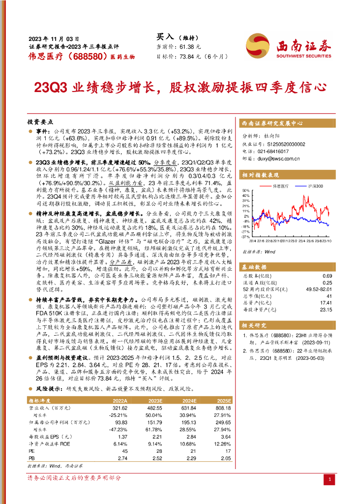 西南证券:伟思医疗(688580)-2023年三季报点评:23Q3业绩稳步增长,股权激励提振四季度信心.pdf
