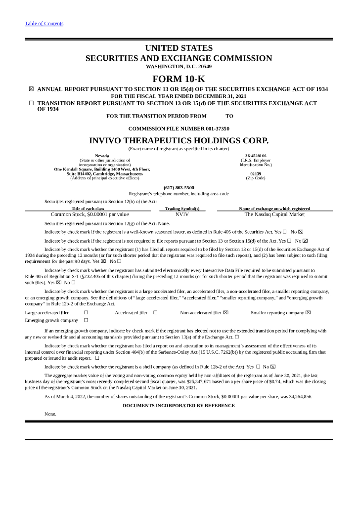 Invivo Therapeutics Holdings Corp(NVIV)2021财年年度报告(英文版).pdf