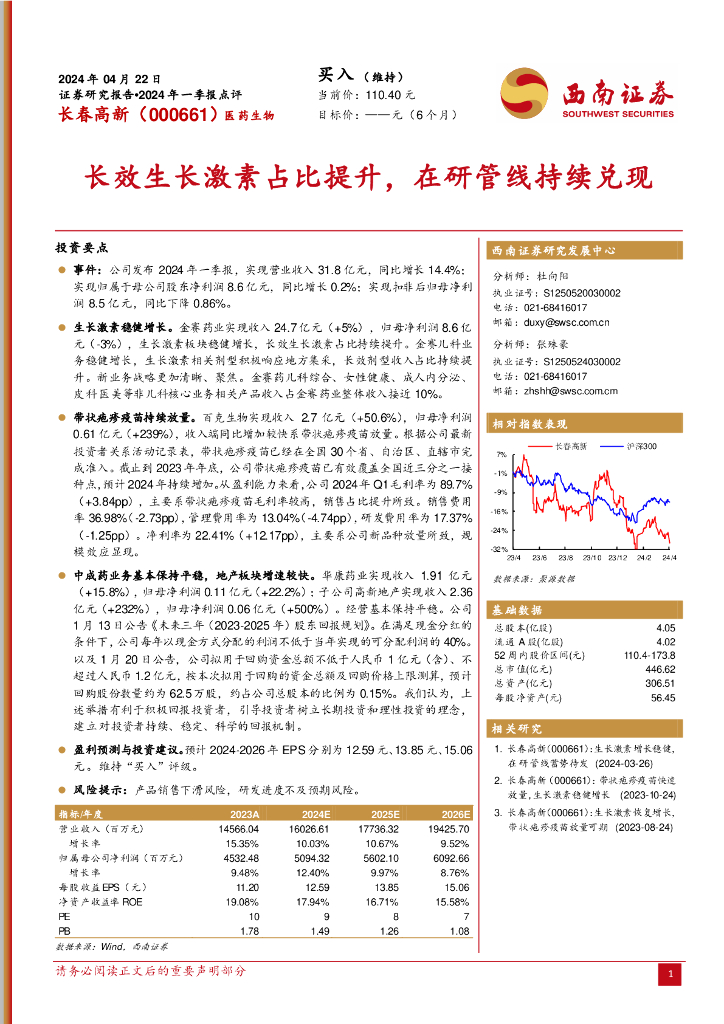 西南证券:长春高新(000661)-2024年一季报点评:长效生长激素占比提升,在研管线持续兑现.pdf