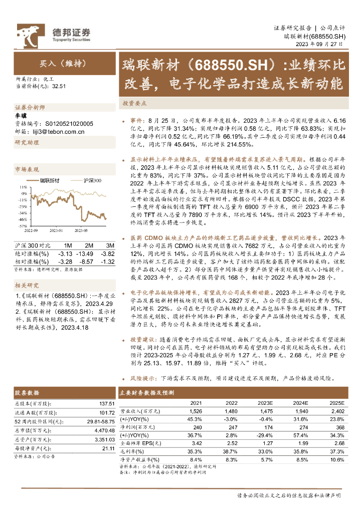 德邦证券:瑞联新材(688550)-业绩环比改善,电子化学品打造成长新动能.pdf