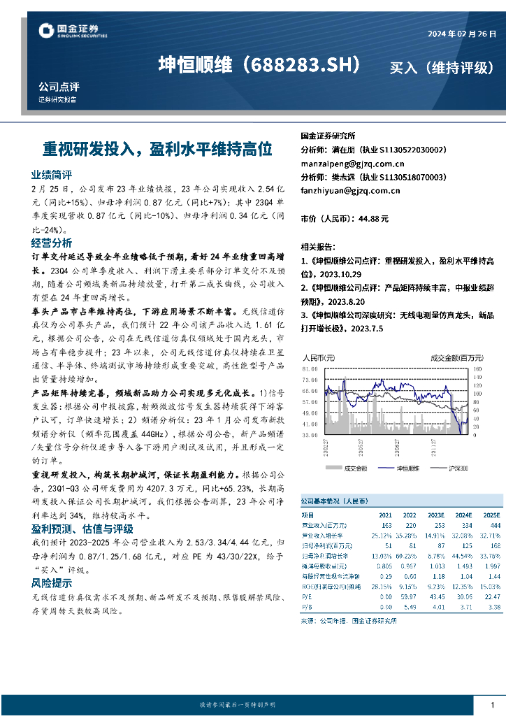 国金证券:坤恒顺维(688283)-重视研发投入,盈利水平维持高位.pdf