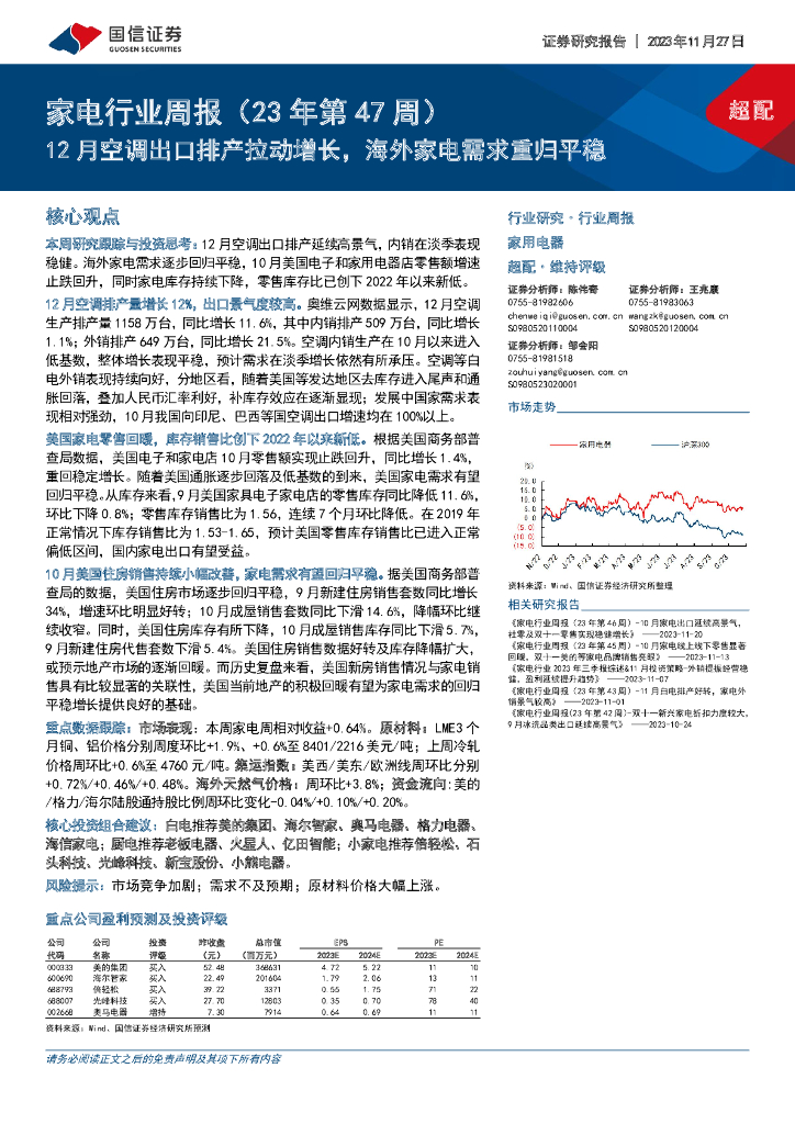国信证券:家电行业周报(23年第47周):12月空调出口排产拉动增长,海外家电需求重归平稳.pdf