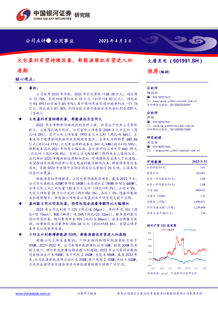 中国银河:大唐发电(601991)-火电盈利有望持续改善,新能源装机有望进入加速期.pdf