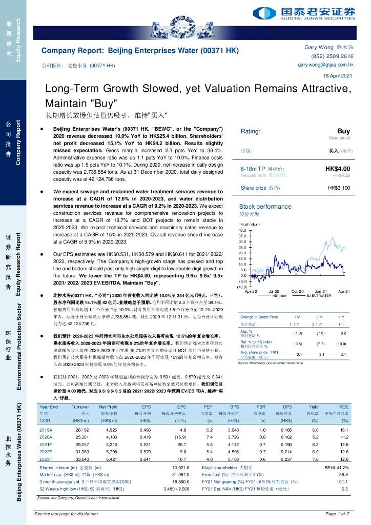 国泰君安证券(香港):北控水务集团(00371)港股公司研究报告-长期增长放慢但估值仍吸引,维持“买入”.pdf