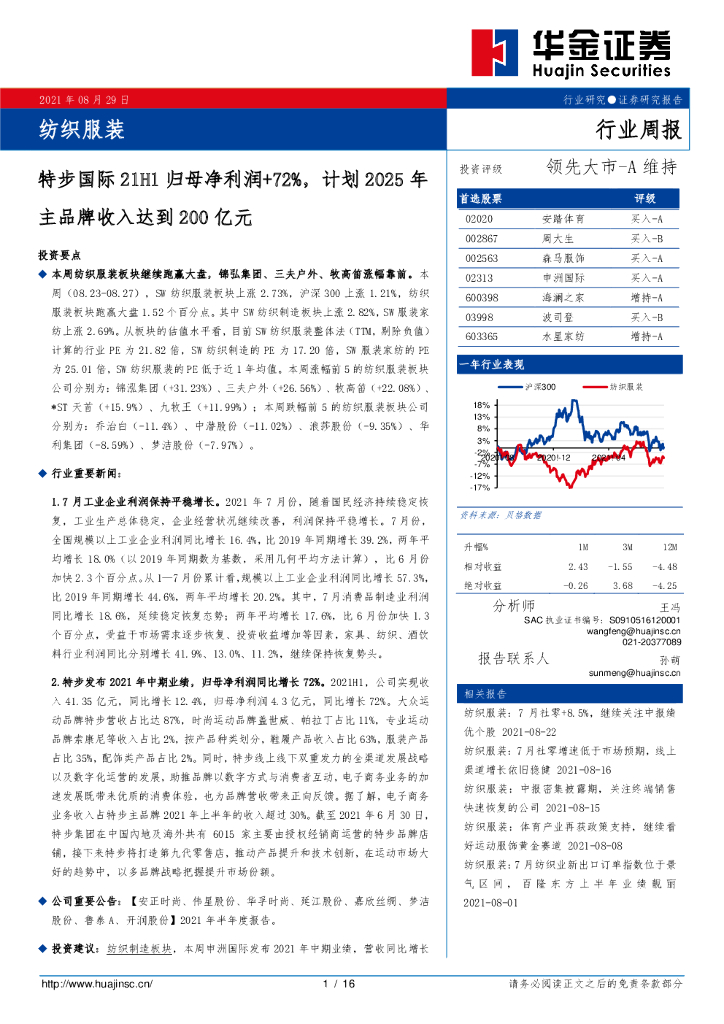 华金证券:纺织服装行业周报:特步国际21H1归母净利润+72%,计划2025年主品牌收入达到200亿元.pdf