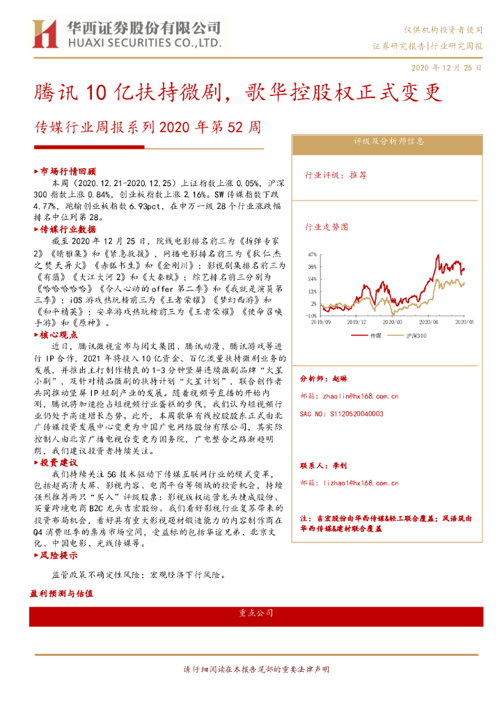 华西证券:传媒行业周报系列2020年第52周:腾讯10亿扶持微剧,歌华控股权正式变更.pdf