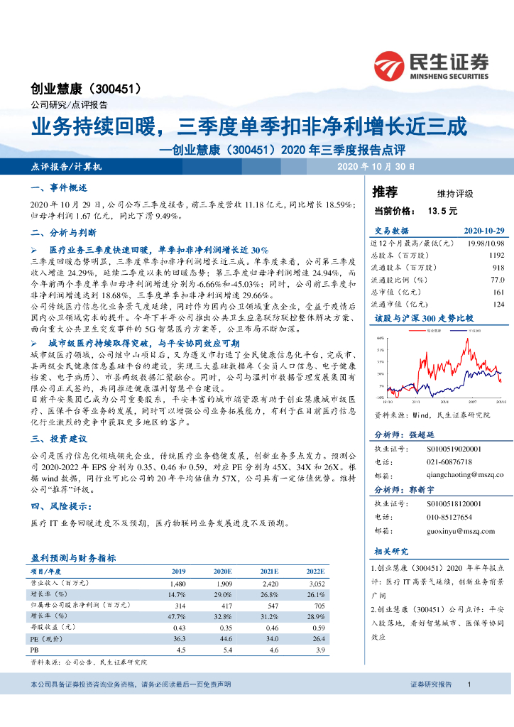 民生证券:创业慧康(300451)-2020年三季度报告点评:业务持续回暖,三季度单季扣非净利增长近三成.pdf