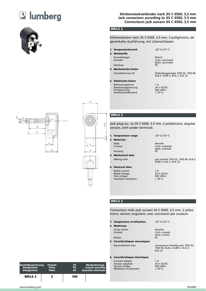 LUMBERG WKLS 2 Klinkensteckverbinder nach JIS C 6560, 3,5 mm Jack connectors according to JIS C 6560, 3.5 mm Connecteurs jack suivant JIS C 6560, 3,5 mm 数据手册.pdf
