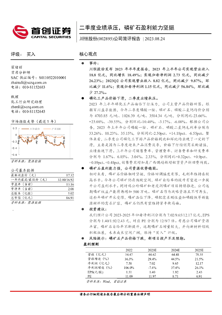 首创证券:川恒股份(002895)-公司简评报告:二季度业绩承压,磷矿石盈利能力坚挺.pdf