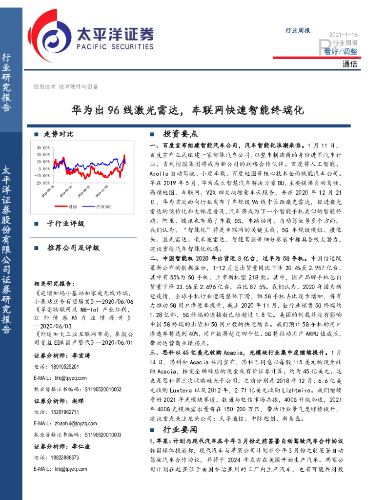 太平洋证券:通信行业周报:华为出96线激光雷达,车联网快速智能终端化.pdf