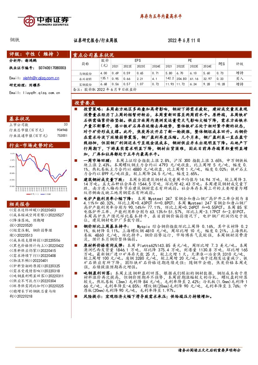 中泰证券:钢铁行业周报:库存为五年内最高水平.pdf