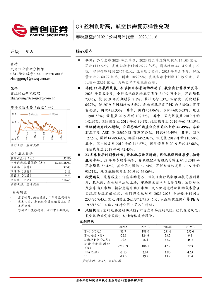 首创证券:春秋航空(601021)-公司简评报告:Q3盈利创新高,航空供需复苏弹性兑现.pdf