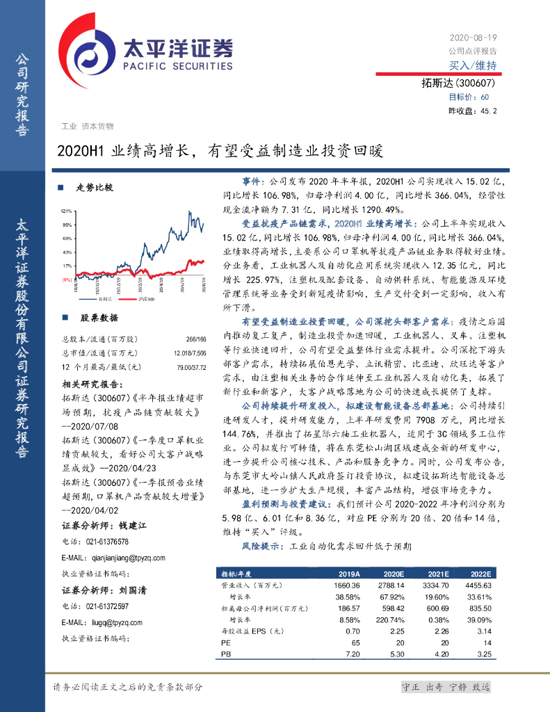 太平洋证券:拓斯达(300607)-2020H1业绩高增长,有望受益制造业投资回暖.pdf