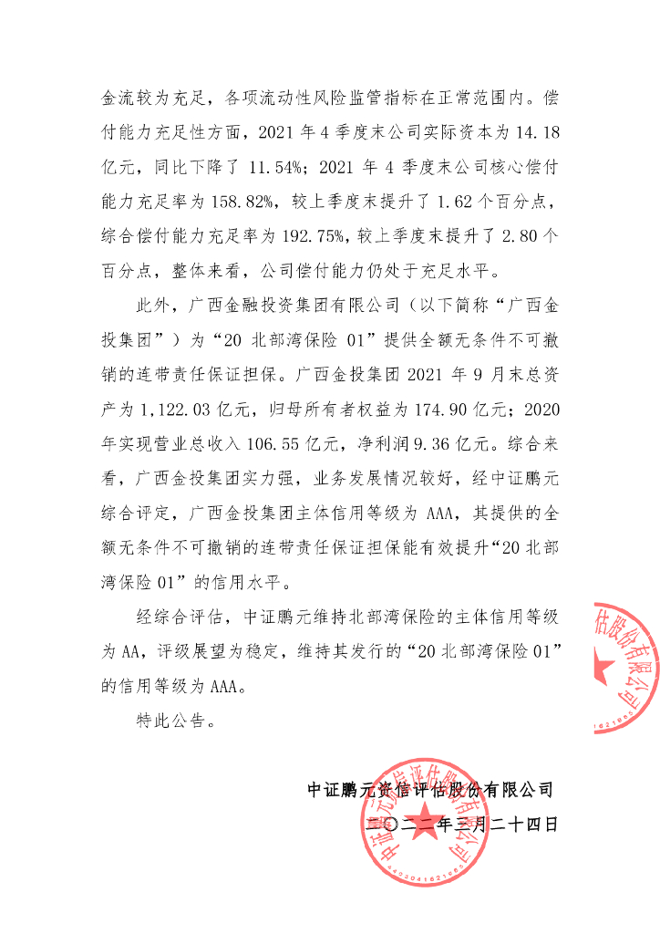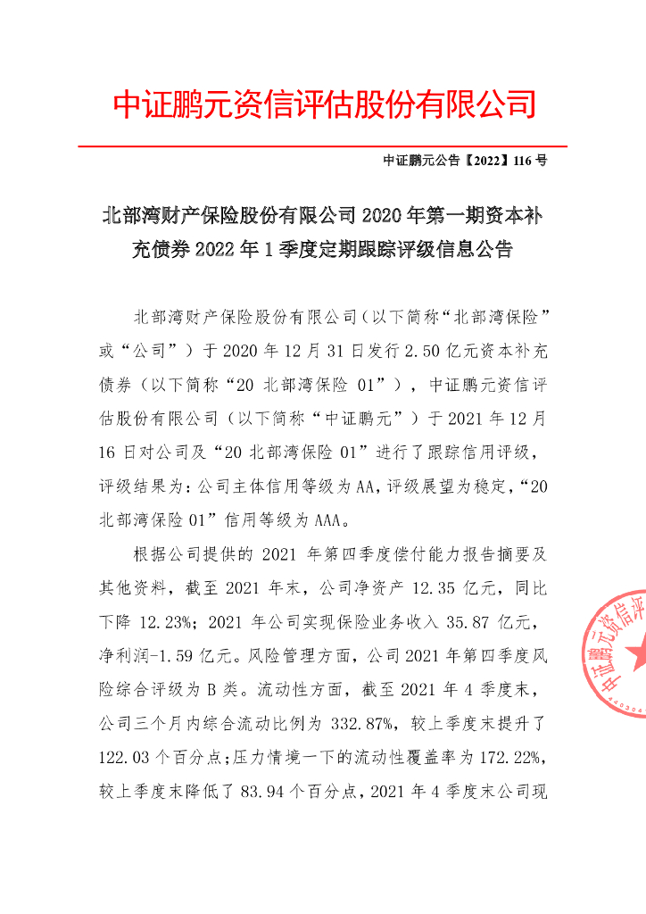 鹏元:北部湾财产保险股份有限公司2020年第一期资本补充债券2022年1季度定期跟踪评级信息公告.pdf