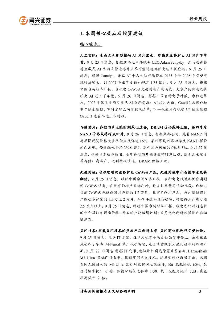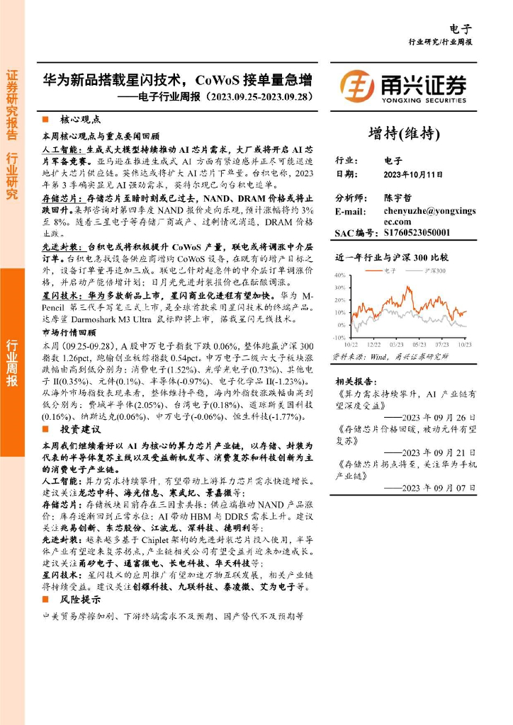 甬兴证券:电子行业周报:华为新品搭载星闪技术,CoWoS接单量急增.pdf