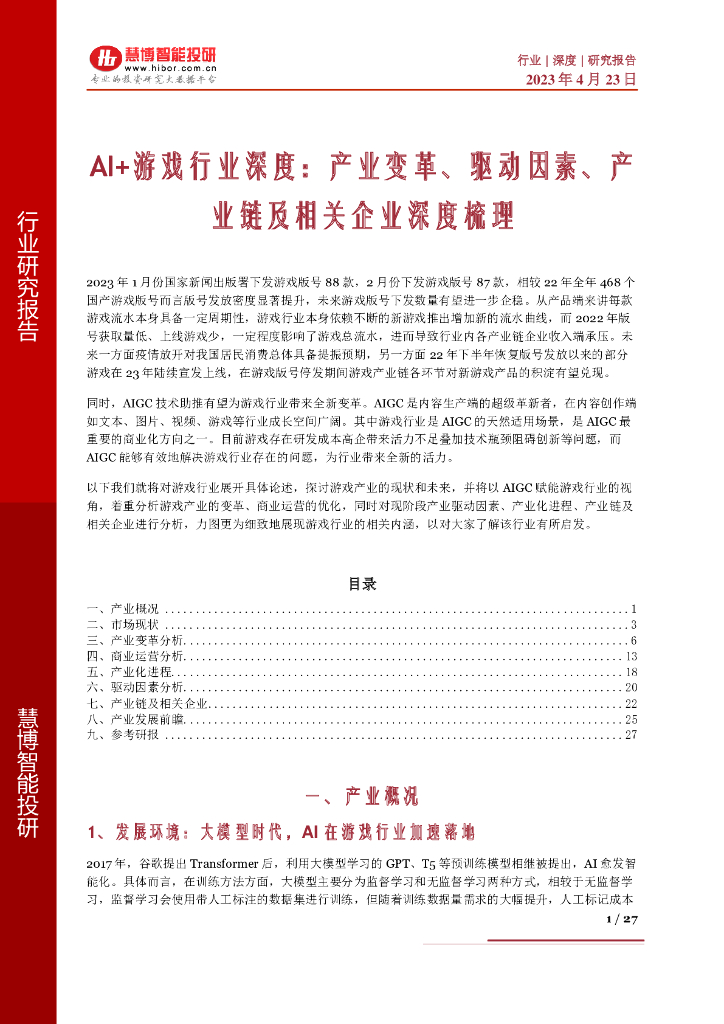 慧博智能投研:Al+游戏行业深度:产业变革、驱动因素、产业链及相关企业深度梳理.pdf