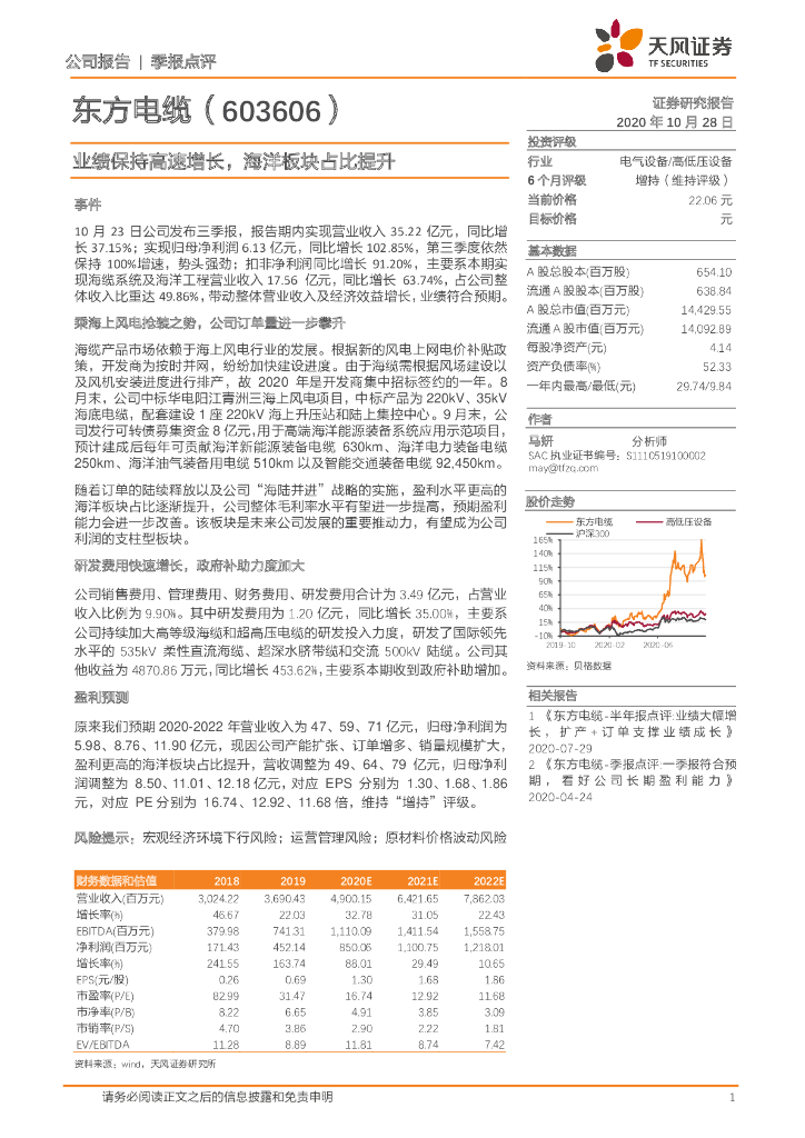 天风证券:东方电缆(603606)-业绩保持高速增长,海洋板块占比提升.pdf
