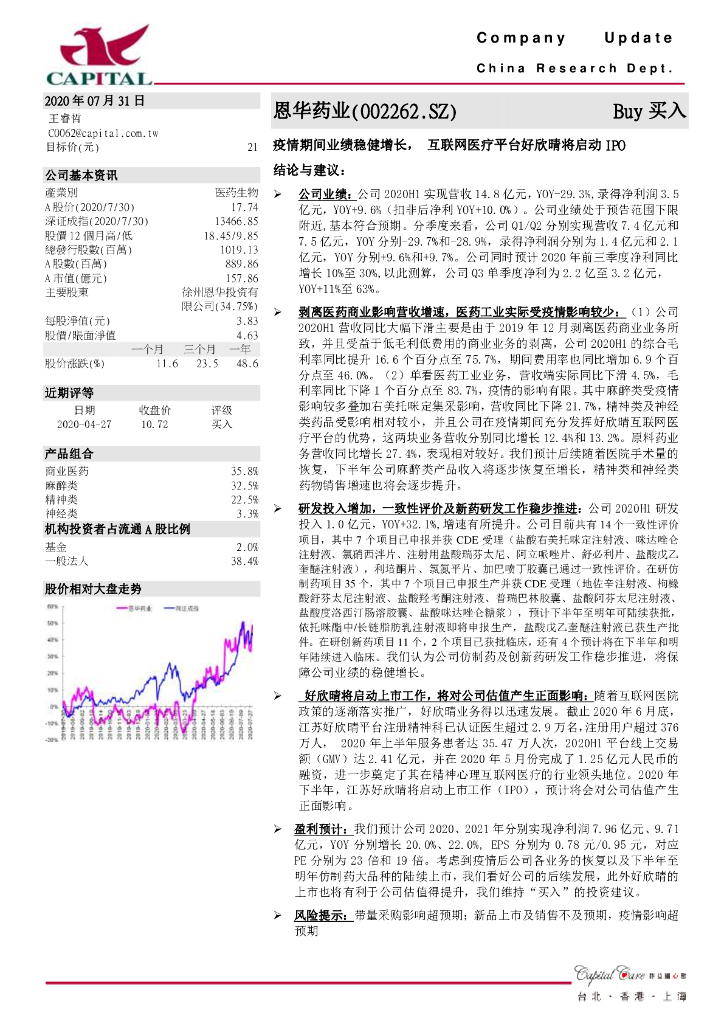 群益证券:恩华药业(002262)-疫情期间业绩稳健增长,互联网医疗平台好欣晴将启动IPO.pdf