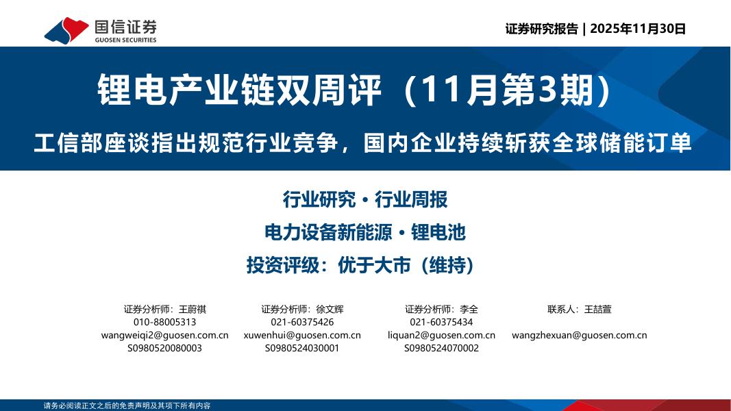国信证券:锂电产业链双周评(11月第3期):工信部座谈指出规范行业竞争,国内企业持续斩获全球储能订单.pdf