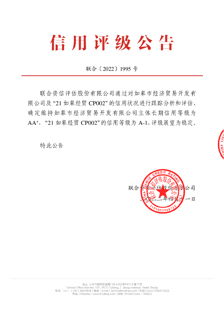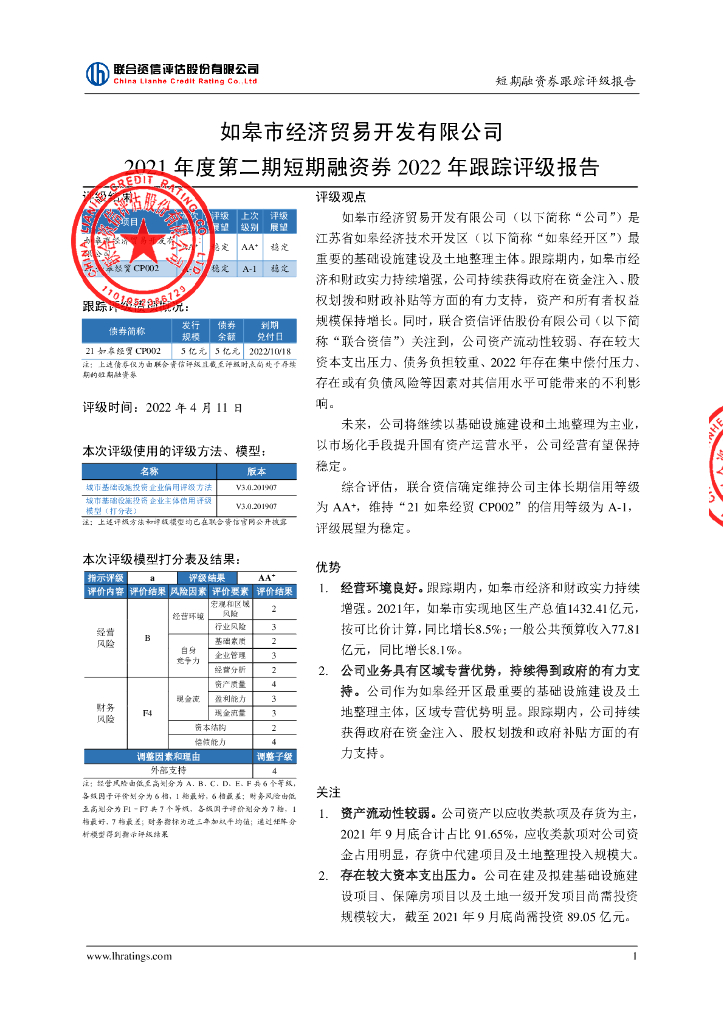 联合资信:如皋市经济贸易开发有限公司2021年度第二期短期融资券2022年跟踪评级报告.pdf