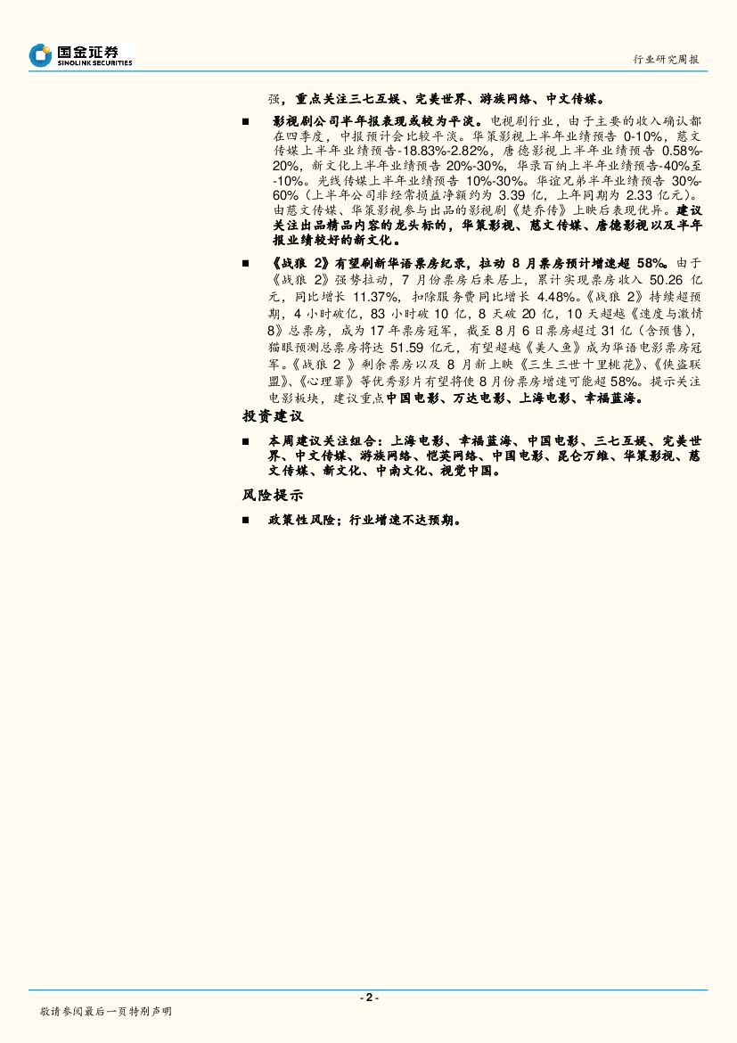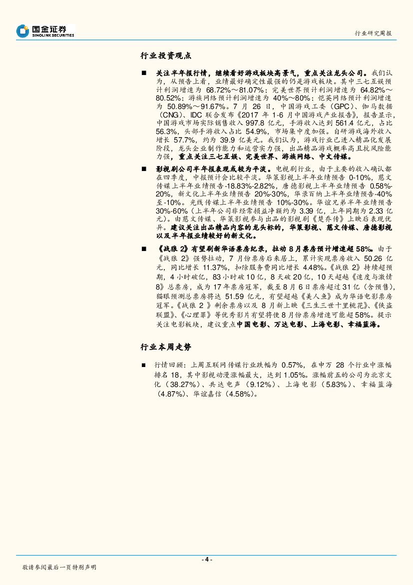 国金证券:传媒互联网研究周报:《战狼2》票房突破31亿,关注半年报行情.pdf