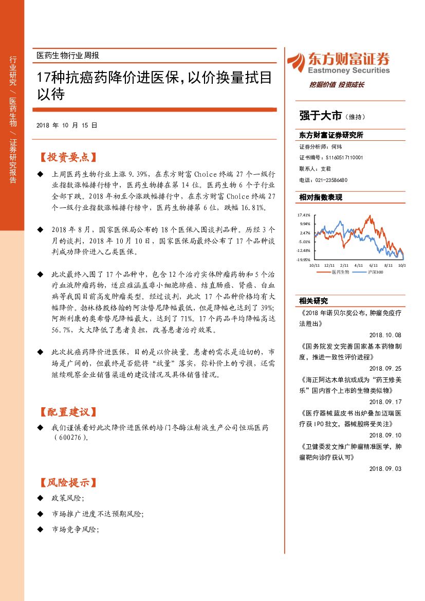 东方财富证券:医药生物行业周报:17种抗癌药降价进医保,以价换量拭目以待.pdf