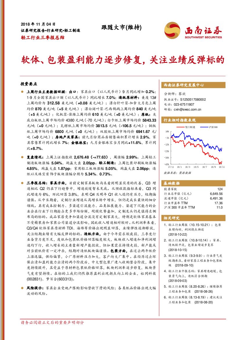 西南证券:轻工行业三季报总结:软体、包装盈利能力逐步修复,关注业绩反弹标的.pdf