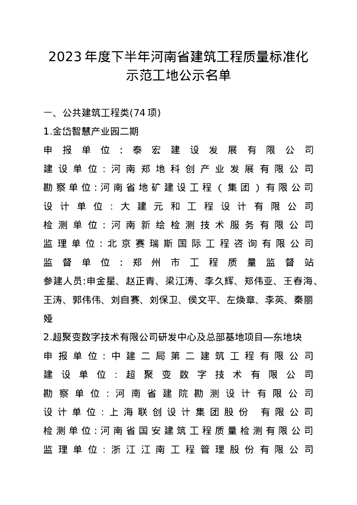 省住房城乡建设厅:2023年度下半年河南省建筑工程质量标准化示范工地公示名单.doc