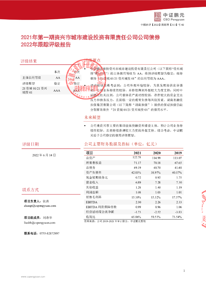 鹏元:2021年第一期资兴市城市建设投资有限责任公司公司债券2022年跟踪评级报告.pdf