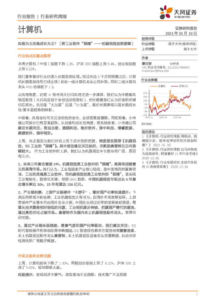 天风证券:计算机行业研究周报:风格为王还是成长为王?(附工业软件“眼睛”——机器视觉投资逻辑).pdf