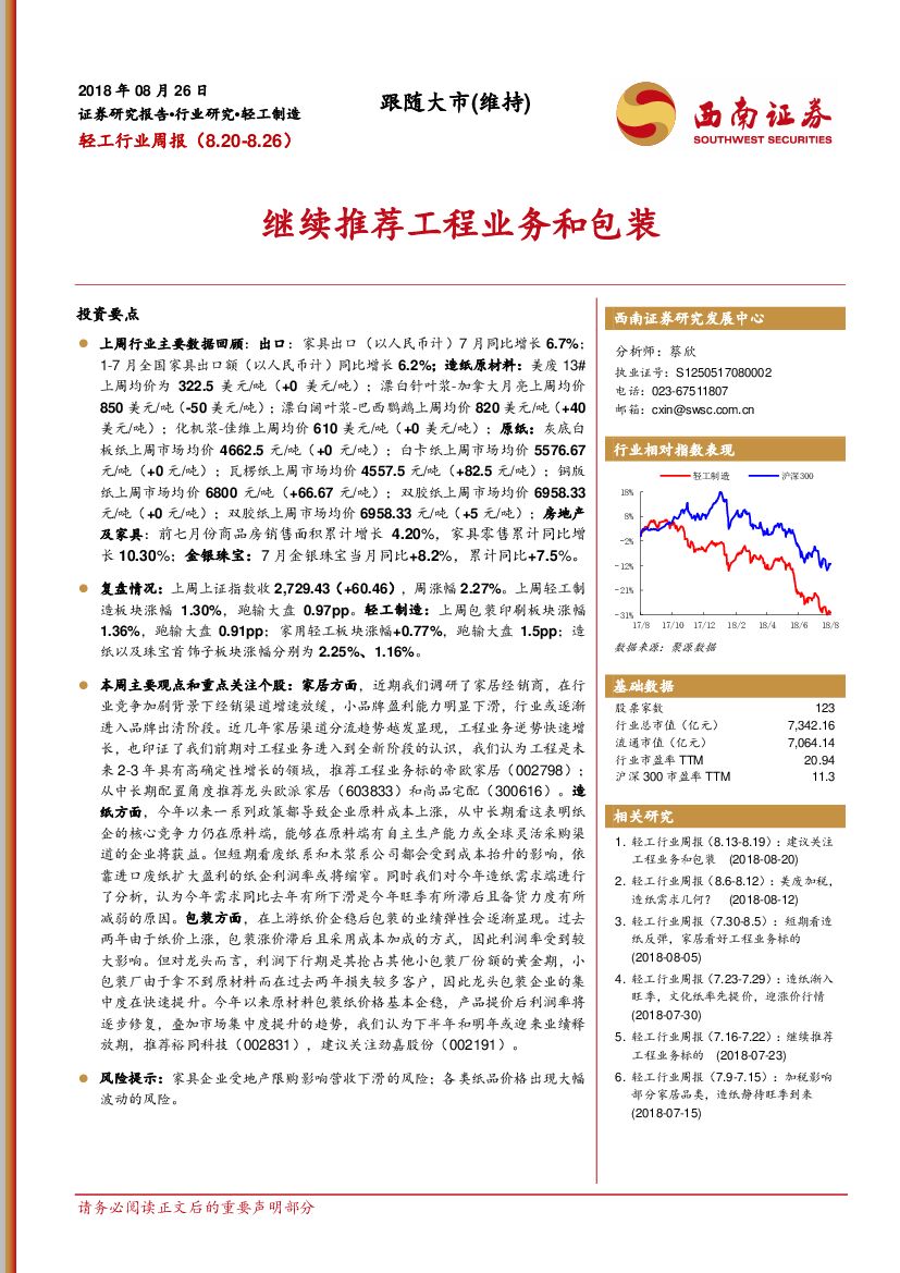 西南证券:轻工制造行业周报:继续推荐工程业务和包装.pdf