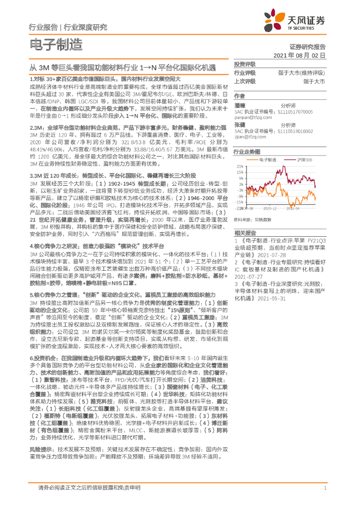天风证券:电子制造行业深度研究:从3M等巨头看我国功能材料行业1→N平台化国际化机遇.pdf