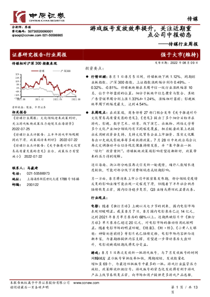 中原证券:传媒行业周报:游戏版号发放效率提升,关注近期重点公司中报动态.pdf