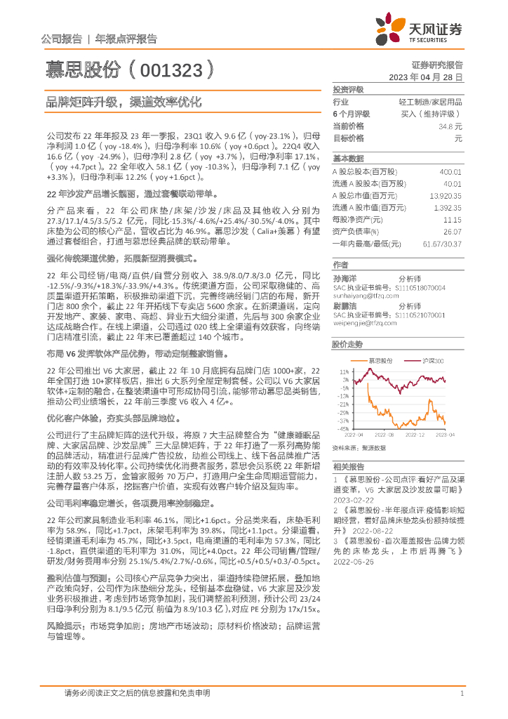 天风证券:慕思股份(001323)-品牌矩阵升级,渠道效率优化.pdf