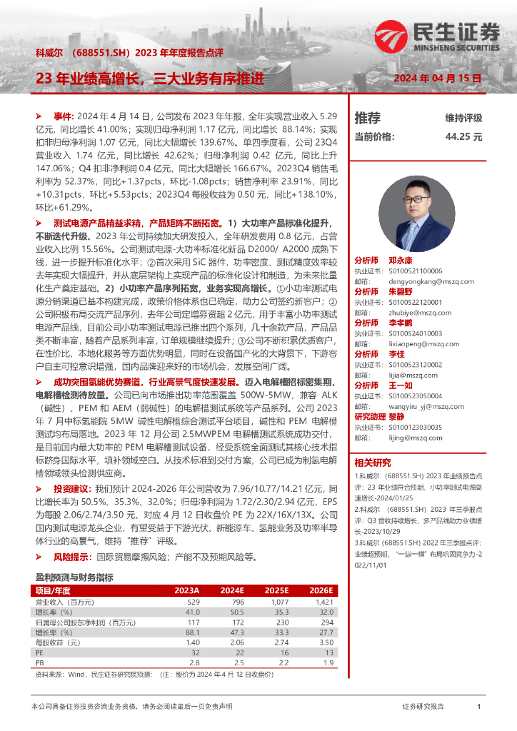 民生证券:科威尔(688551)-2023年年度报告点评:23年业绩高增长,三大业务有序推进.pdf