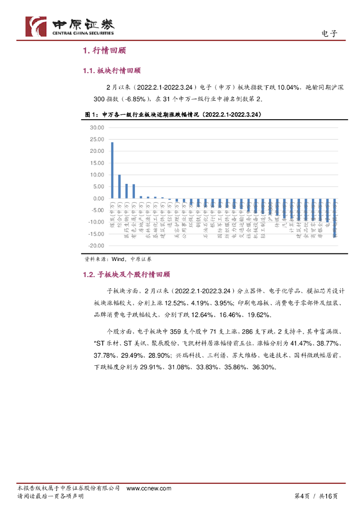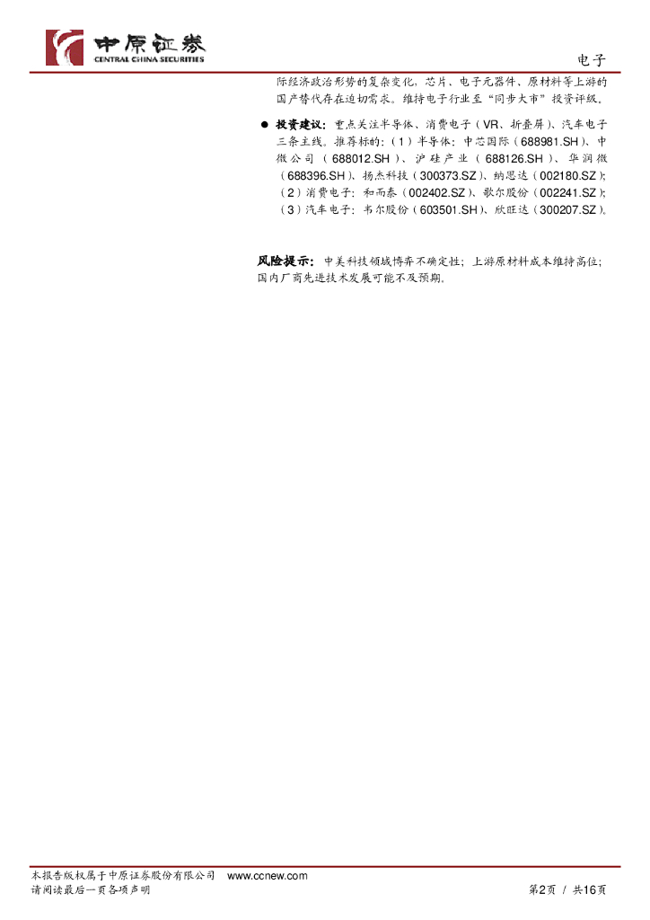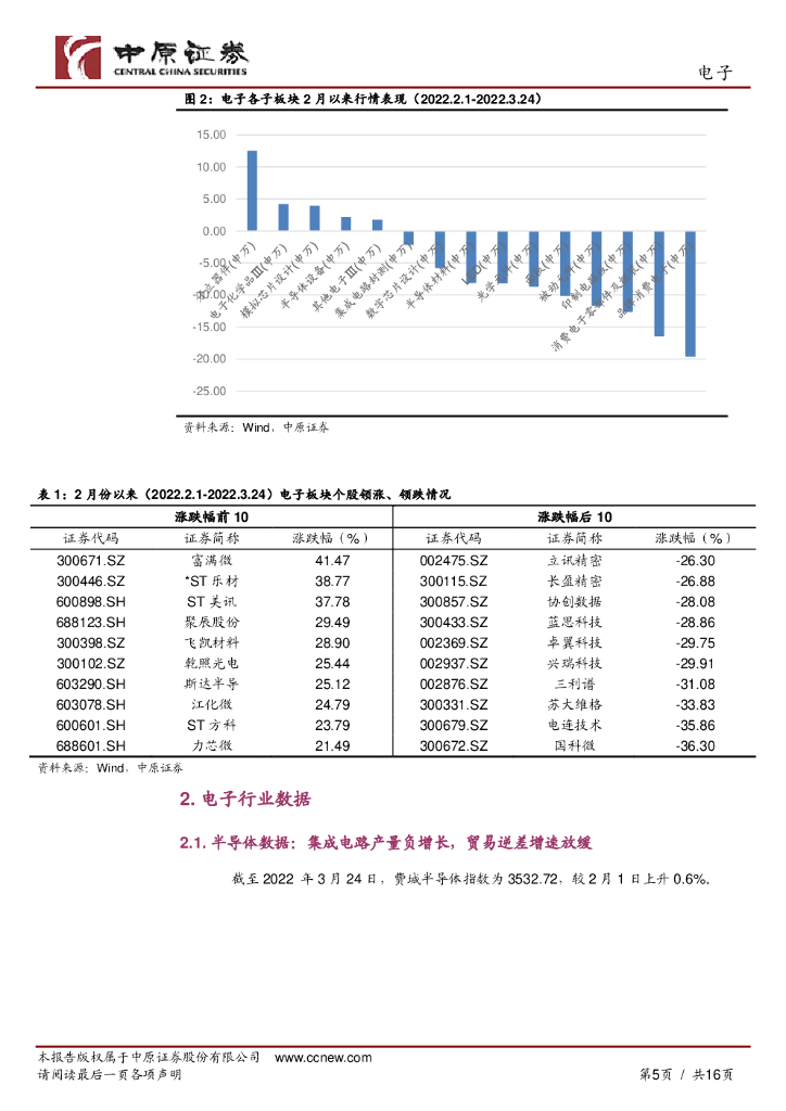 中原证券:电子行业月报:行业表现分化,重点关注汽车电子和功率半导体.pdf