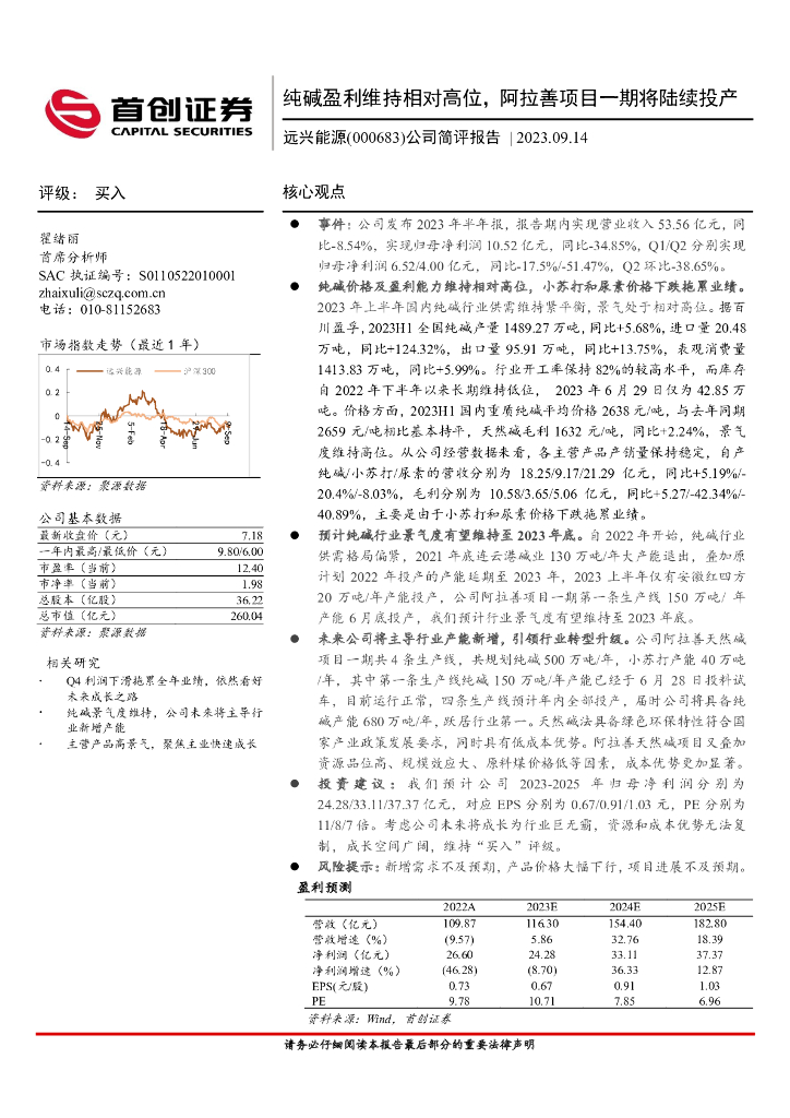 首创证券:远兴能源(000683)-公司简评报告:纯碱盈利维持相对高位,阿拉善项目一起将陆续投产.pdf