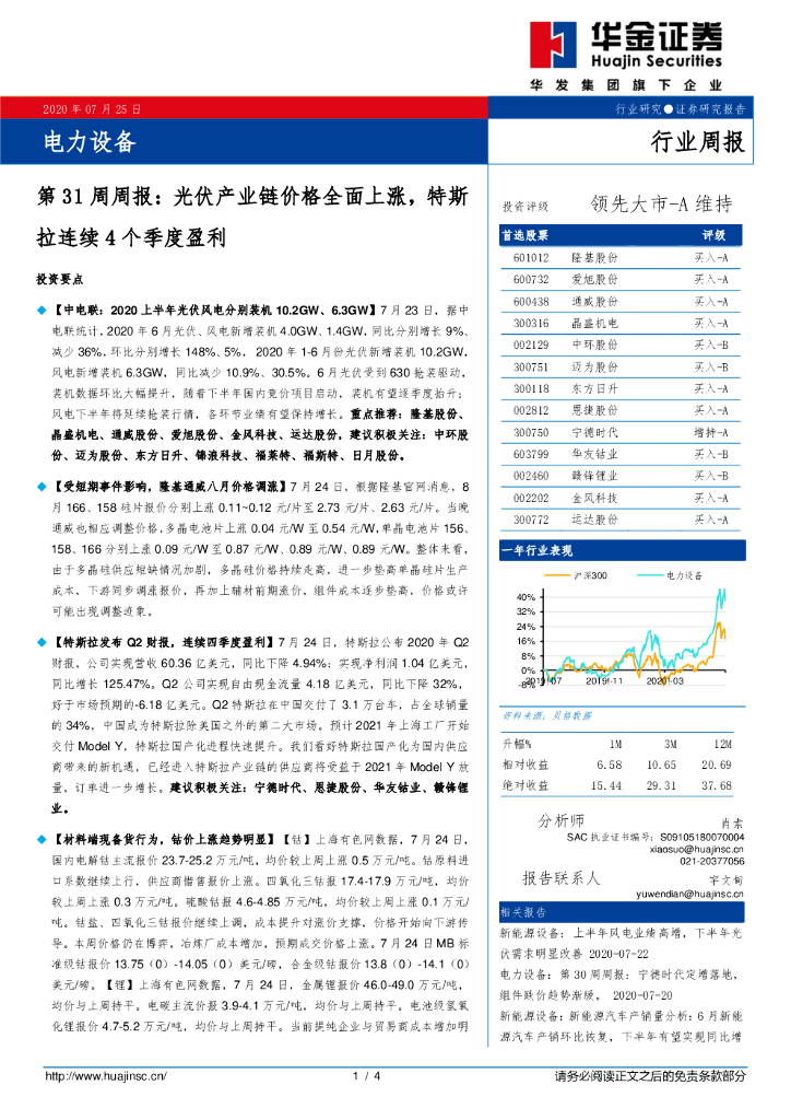 华金证券:电力设备行业周报:第31周周报:光伏产业链价格全面上涨,特斯拉连续4个季度盈利.pdf