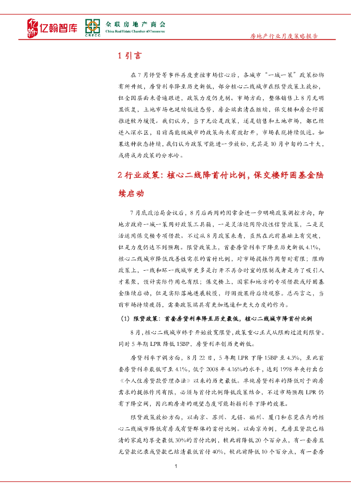亿翰智库:8月房地产行业月报(第50期):核心城市降首付开启,政策或迎分水岭.pdf